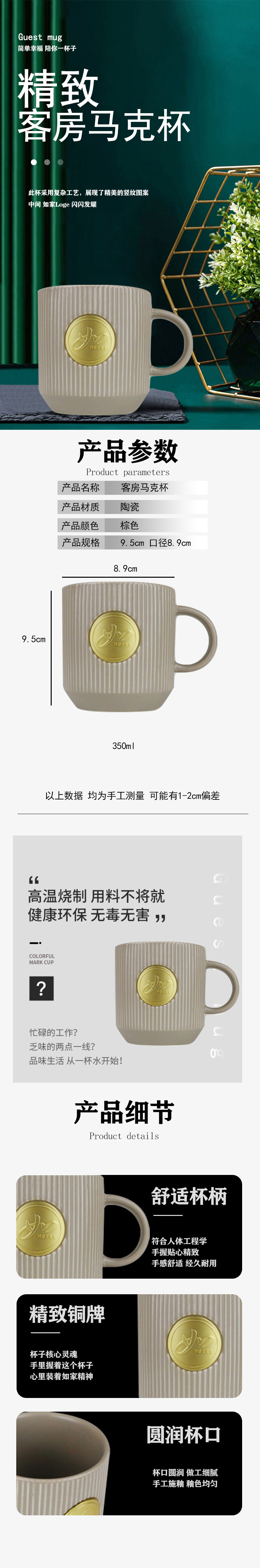 RJ-酒店用品-马克杯/客房/亚光灰/铜牌/陶瓷杯/如家精选4.0